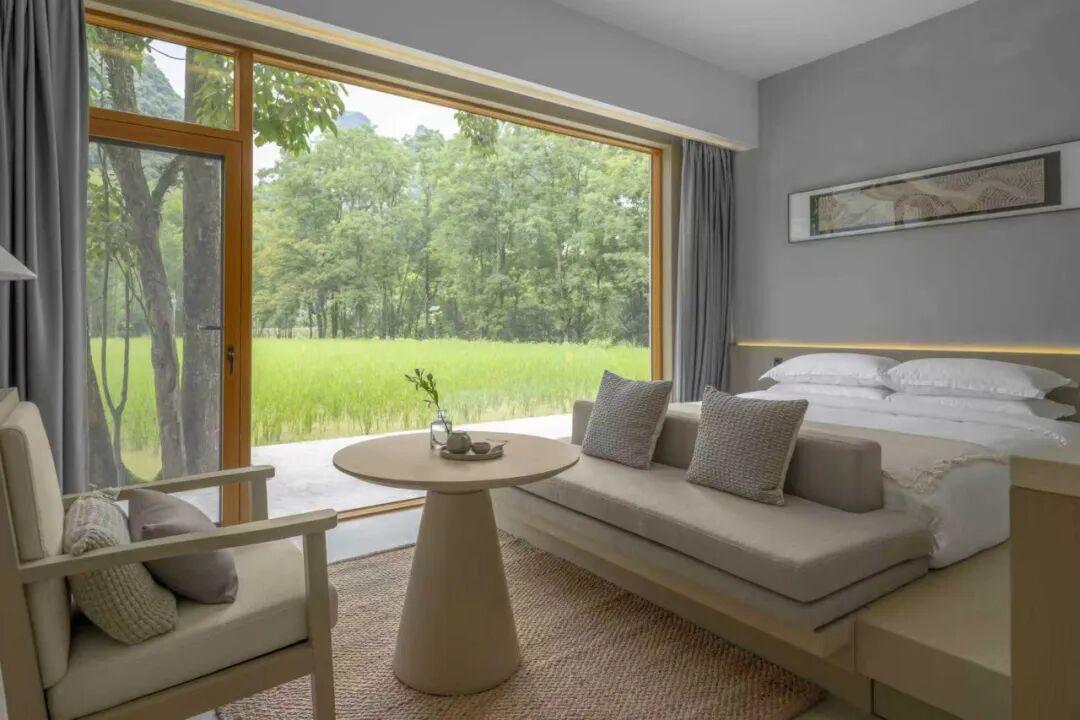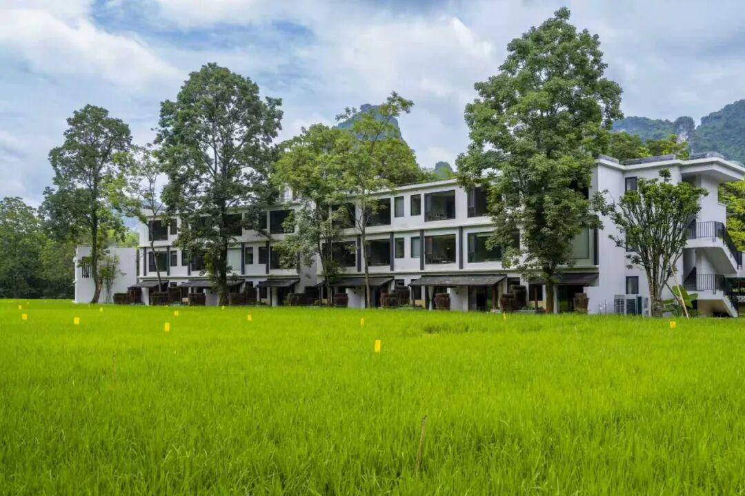酒店以⽥园社区为骨,以在地“那⽂化”为魂,循着“⼀⻝⼀宿,皆有态度”的度假理念,将稻⽥景致与农乐互动悄悄织入日常。抬眼是远⼭含黛,低头是稻穗轻晃,蓝天铺展成穹顶,绿野漫延至溪畔,城市的忙碌被溪水冲走,只留静谧在心底生长。