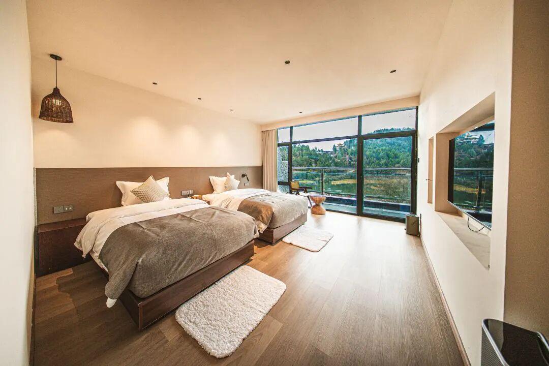 述野以“山水为骨,非遗为魂”,把非遗技艺融入度假体验。客人可参与唐卡绘制、藏香手作、矿物颜料研磨等体验,让传统技艺成为疗愈身心的修行。大堂火炉延续千年围炉叙事,非遗歌谣与篝火晚会交织出现代与传统的对话。在述野,您不只是入住一间酒店,而是抵达一处自然与人文交融的隐世原乡。以藏式碉楼肌理为原型,石木为材,屋顶随山势起伏,宛如凝固的雪浪。酒店共计12间客房,空间与山水相依,室内外视线相连,真正做到“把自然搬进空间”。这里不仅是度假空间,更是承载“人文山水”的文化坐标。