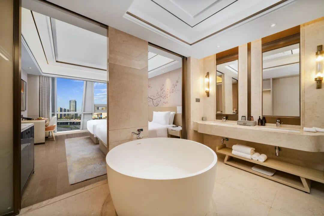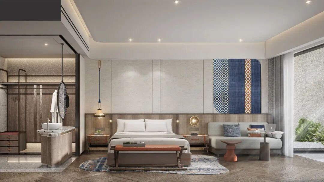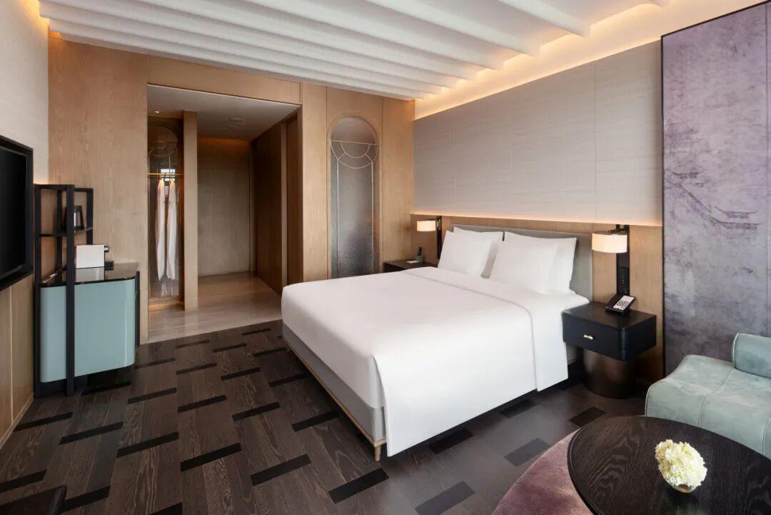 酒店的设计灵感源于唐代大运河码头的盛景,向本地传统致敬。当代灯光装置与现代艺术重新诠释了隋唐时代的浪漫与神秘,呼应运河的温柔流淌。以流畅线条和鲜明色彩为特征的欧洲装饰艺术设计理念被优雅地融入设计之中,创造出东方与西方、过去与现在之间引人入胜的对话。酒店拥有313间优雅舒适的客房及套房,涵盖八大房型,包括家庭亲子房及宠物友好房选项。每间客房面积均超过41平方米,坐拥静谧的扬州风格园林景致,为宾客提供一方静谧休憩之所。