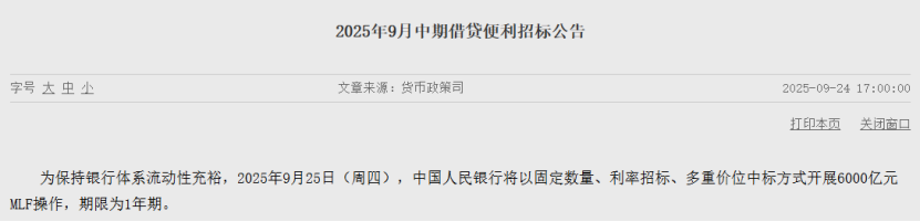 为保持银行体系流动性充裕,中国人民银行9月24日发布预告称,将在25日以固定数量、利率招标、多重价位中标方式开展6000亿元中期借贷便利(MLF)操作,期限为1年期。鉴于9月有3000亿元MLF到期,本月央行MLF净投放将达到3000亿元,为央行连续第七个月对MLF加量续作。